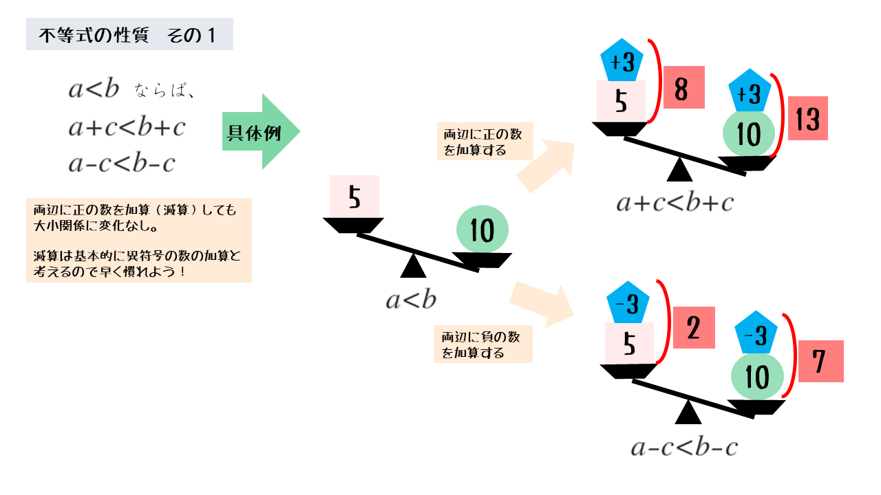 等式の性質では減算も扱いますが、減算は負の数の加算と考えると、不等式では1つの性質で説明できます。マイナスの符号を見て、減算と間違わないようにしましょう。