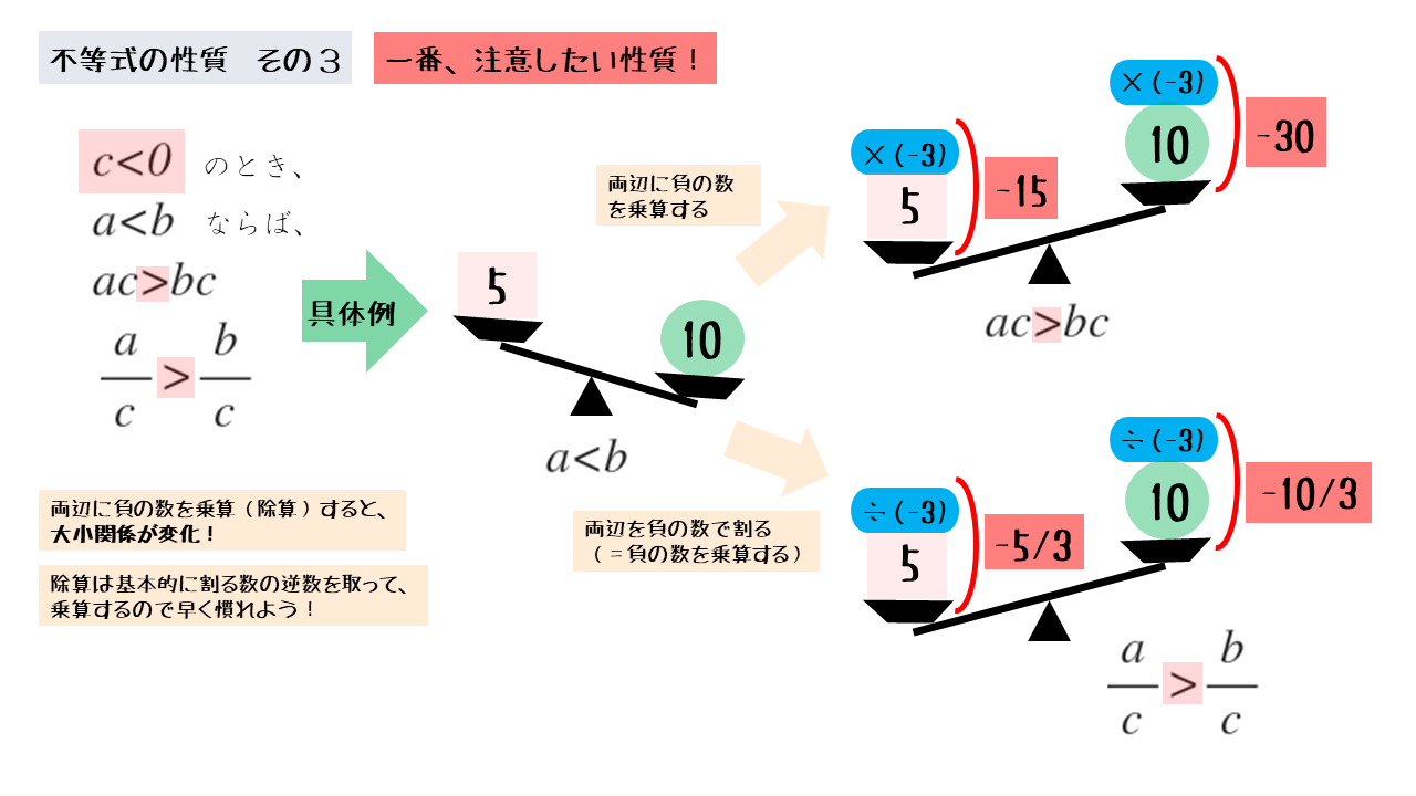 この性質も式変形に用いられますが、不等式の性質の中で特に間違いやすい性質です。符号の付け忘れはもちろんですが、不等号の向きを変え忘れることが多いので注意しましょう。