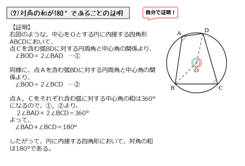 \begin{align*} \quad \angle BAD + \angle BCD = 180^{\circ} \quad \cdots \text{③} \end{align*}四角形の対角である∠BADと∠BCDの関係は、③式のように表せます。これより、円に内接する四角形の対角の和が180°であることを示すことができました。