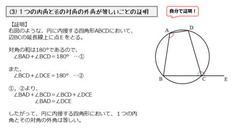 1つの内角とその対角の外角は等しいことの証明は、円に内接する四角形の対角の和が180°であることを利用します。