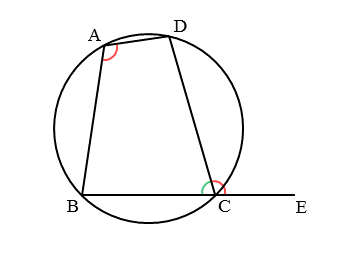 図のように、四角形ABCDが円に内接するとき、辺BCの延長線上に点Eをとります。このとき、円に内接する四角形の対角の和を利用します。