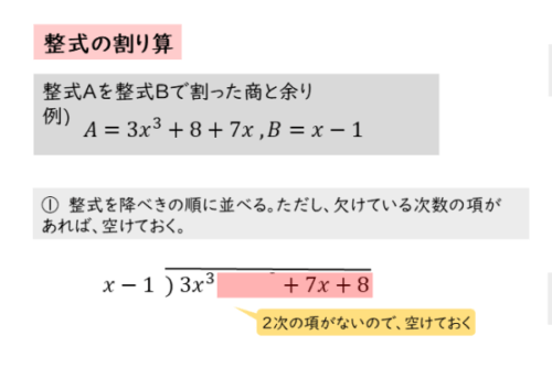 どちらの注意事項にも言えることは、「次数に注意を払え」ということです。整式には桁というものがありません。その代わり、次数で判断します。