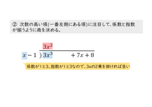 整式の割り算のコツは、割られる整式や余りの最高次数の項をつねに意識することです。商を考えるときも、まだ計算を続けるべきかも最高次数の項を見れば判断することができます。