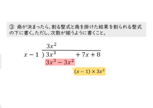 新たな割り算を行います。ここでも、余りの中で最高次数の項(ここでは3x2)に注目して商を決めます。