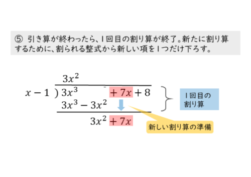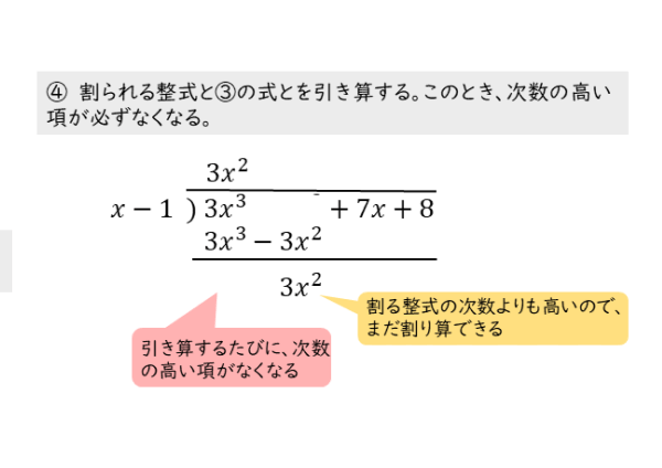 とにかく、最高次数の項を順に消すことを繰り返すのが、整式の割り算。