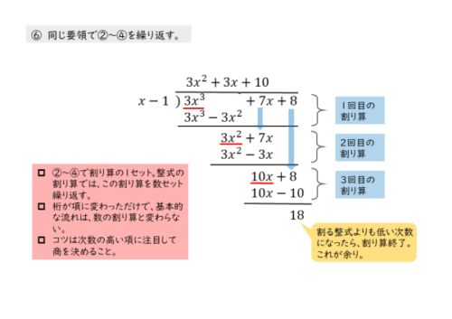 - 余りの次数が、割る整式Bの次数より低くなるか、余りが0になるまで計算を続ける。