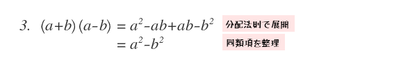 2番目の式は、1番目と同様に分配法則を利用しても良いですが、1番目の式でbから-bに置き換えたと考えると、1番目の式の結果を利用して展開できます。