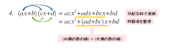 4番目の乗法公式は、因数分解で学習するたすき掛けに関わる。展開するときにカッコ内の項がそれぞれどの項と関わるのかを知っておこう。