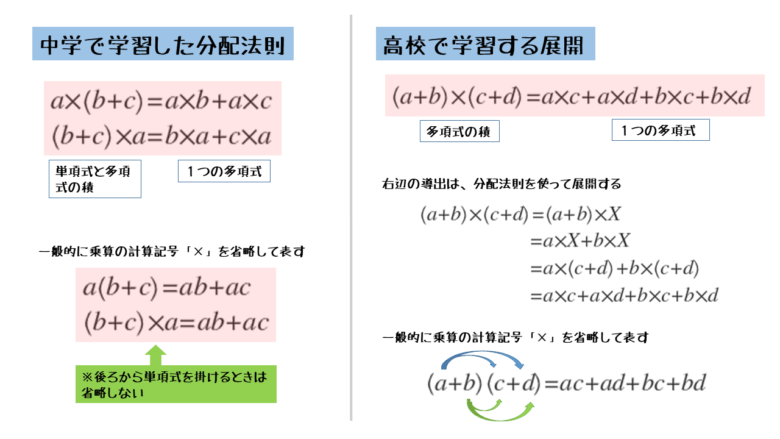中学での分配法則は、主に単項式と多項式の積から1つの多項式に書き換えるときに使われます。それに対して、高校での分配法則は、主に多項式どうしの積から1つの多項式にするときに使われます。