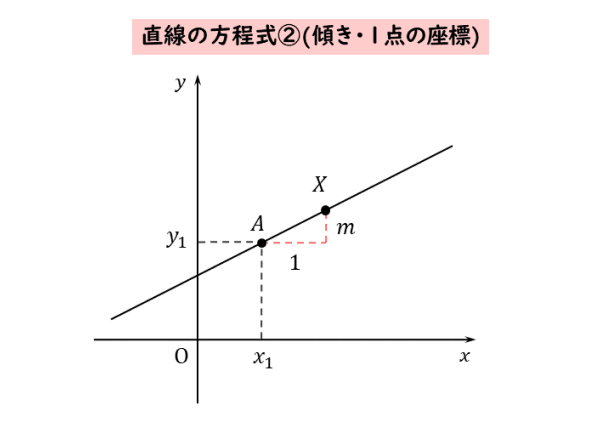 直線の方程式を、傾きと1点の座標を用いて表すと以下のようになります。