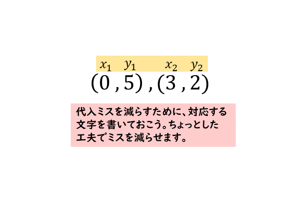 2点の座標を用いた公式を利用するとき、慣れないうちは代入ミスが多いです。公式を余白に書いたり、座標の上や下に対応する文字を書いたりすると代入ミスを減らせます。
