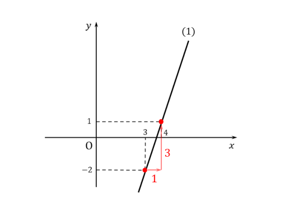 問(1)では、作図すれば、傾きが3であることがすぐに分かります。この場合、傾きと1点の座標で表される直線の方程式を利用することもできます。