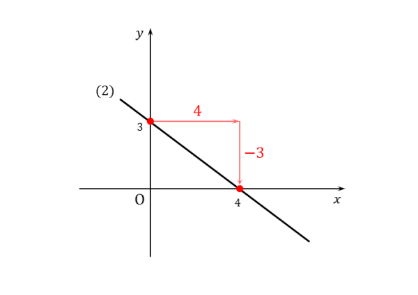 \begin{align*} \quad (4 \ , \ 0) \ , \ (0 \ , \ 3) \end{align*}与えられた2点の座標を確認すると、2点のx座標が異なります。2点の座標で表される直線の方程式に、与えられた座標を代入します。