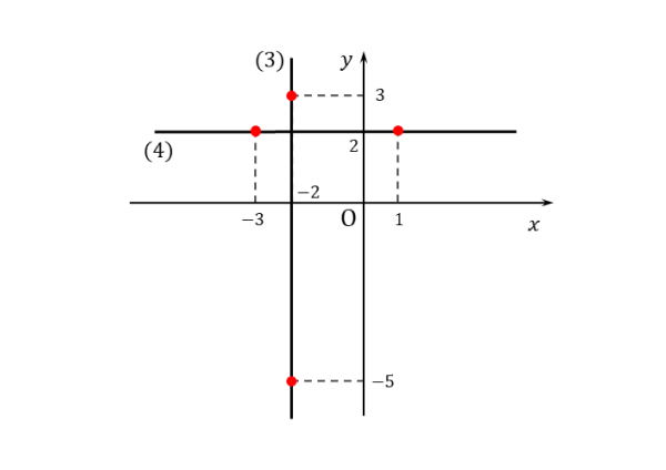 \begin{align*} &\quad -8 \left\{x-(-2) \right\}-0 \cdot \left(y-3 \right)=0 \\[ 7pt ] &\quad -8 \left\{x-(-2) \right\}=0 \\[ 7pt ] &\quad x-(-2)=0 \\[ 7pt ] &\quad x=-2 \end{align*}問(3)の直線は、問(4)の直線と合わせて図示しています。問(4)の解答例を参照してください。