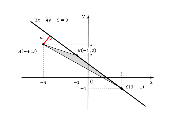 \begin{align*} &\quad \vdots \\[ 7pt ] &\quad 3x+4y-5=0 \end{align*}点 $A$ と直線 $BC$ の距離を $d$ とすると