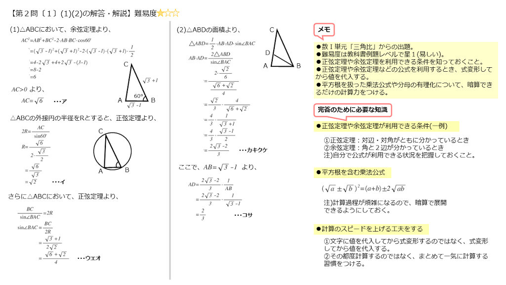 「図形と計量」に関する問題では、一般に、図形を扱うのが原因なのか、教科書例題レベルでも難しく感じます。しかし、本問に関して言えば、比較的解きやすい部類だったので、完答しないと勿体ないレベルです。