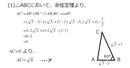 小問(1)は、余弦定理や正弦定理を利用する基本的な問題でした。すぐに方針が立つので、ミスなく速やかに解きたい問題です。