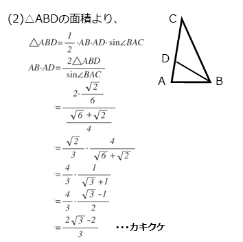 作図していれば、∠BAD=∠BACであることに気付けたでしょう。それに、この関係からsin∠BACの値を利用できることにも気付きます。
