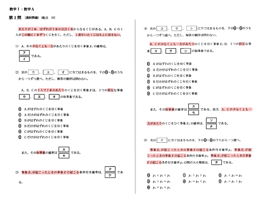 これまでの出題内容や形式とは若干趣が異なったので、特に「排反」に関する問題では面食らった人が多かったかもしれません。ただ何となく確率を求めていた人には完答するのが難しかったと思われます。
