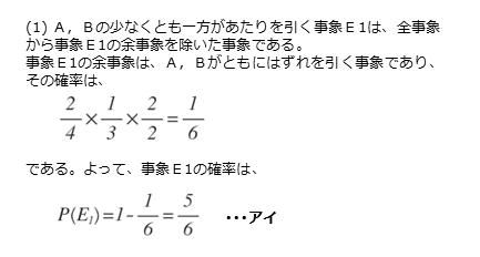 事象E1の余事象は「A,Bがともにはずれのくじを引く事象」です。この余事象の確率は、「Aがはずれを引く確率」×「Bがはずれを引く確率」×「Cがあたりを引く確率」で求めることができます。