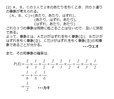 $3$ 人で $2$ 本のあたりのくじを引く事象を書き出すと