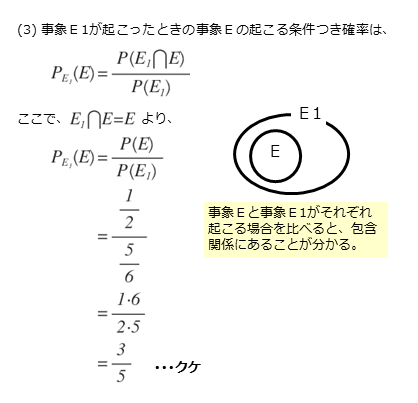 小問(1),(2)できちんと結果を書き残しておけば、簡単に共通部分E1⋂Eに関する場合の数や確率を求めることができるでしょう。