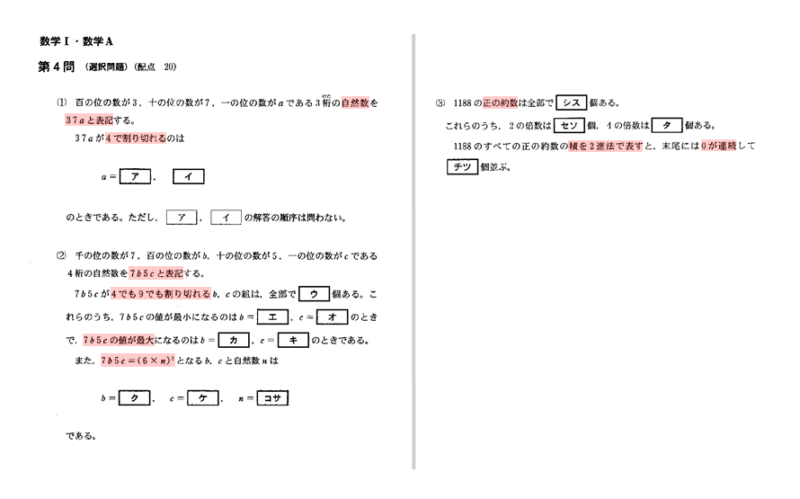 数学1・Aの第4問は数A「整数の性質」からの出題でした。ベースになるのは小学校で学習した約数や倍数などです。