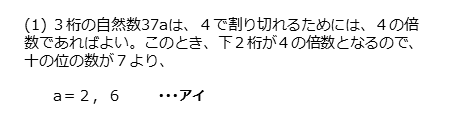 また、3桁の自然数は、4で割り切れるので4の倍数になります。整数の性質を知っているかどうかが問われています。