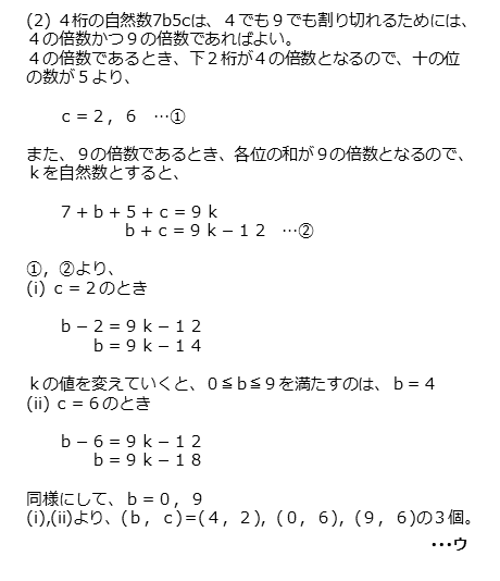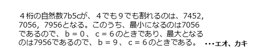 解答欄ウで求めた3個のb,cの組から、4桁の自然数7b5cが最小または最大となるものを見つけます。