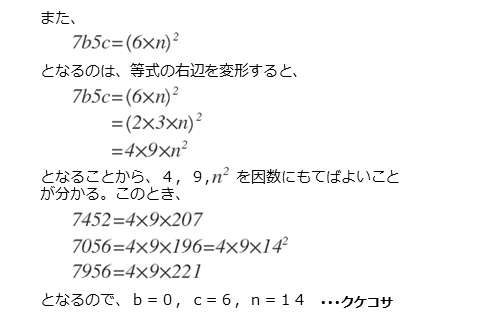 4桁の自然数7b5cは7056,7452,7956と分かっているので、それぞれ変形して確かめます。その前に、(6×n)2=36×n2と変形しておきます。
