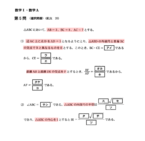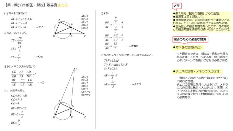 \begin{align*} \quad AF =\frac{21}{5} \end{align*}解答欄オカキ,クケコの記述例は以下の通りです。
