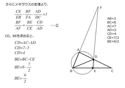 \begin{align*} \quad \frac{FB}{FA} = \frac{BE}{CE} \cdot \frac{CD}{AD} \end{align*}ここで
