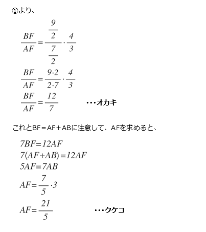 解答欄オカキに関する問題は、2つの線分BF,AFの長さの比の値BF/AFを求める問題です。また、解答欄クケコに関する問題はAFの値を求める問題です。