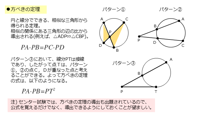 ところで、方べきの定理を利用できる図形には3パターンあるので、使い分けができるようにしておきましょう。