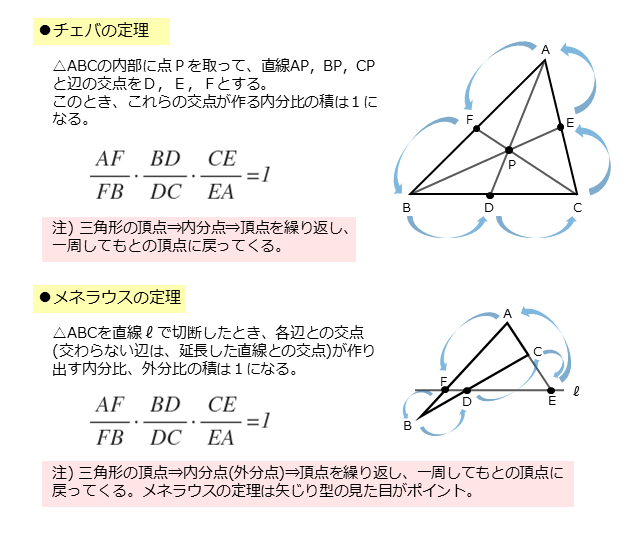 なお、チェバの定理やメネラウスの定理では、その覚え方にコツがあります。