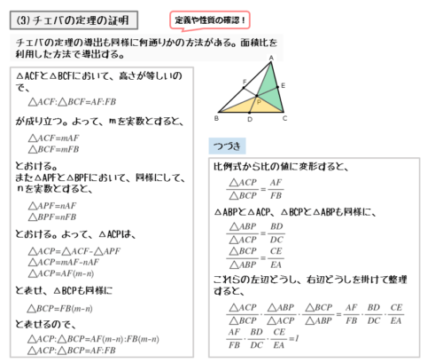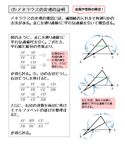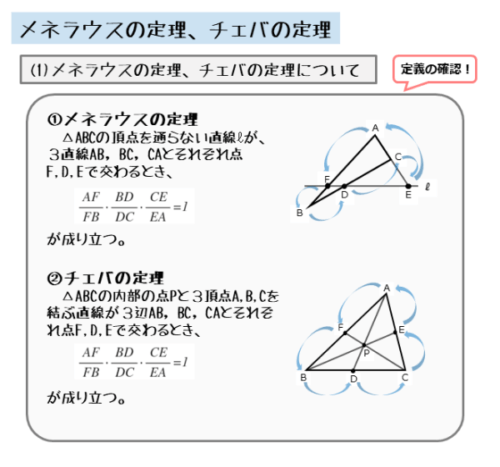 メネラウス定理とチェバの定理は、既習内容で導出できる定理。既習内容の復習や、式変形のテクニックなどを学べるので、積極的に定理や公式の導出に取り組もう。