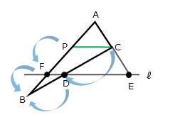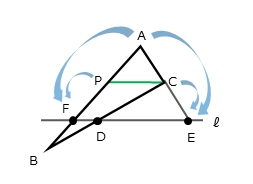 先ほどの図に補助線を加えます。点Cを通り、直線ℓに平行な直線を引き、この直線と辺ABとの交点をPとします。