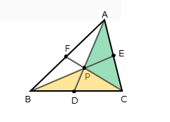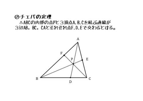 - 内部の点Pと三角形の頂点A,B,Cとを通る直線AP,BP,CPをひき、辺と交点をつくる(内分点D,E,Fができる)。