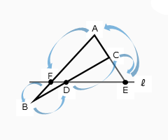 以下の手順でメネラウスの定理が成り立つ図形を作図します。