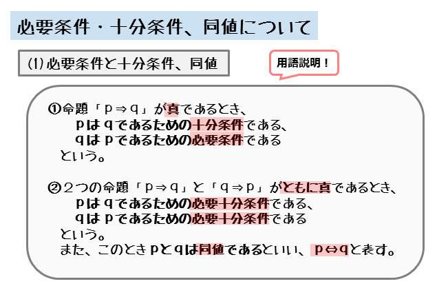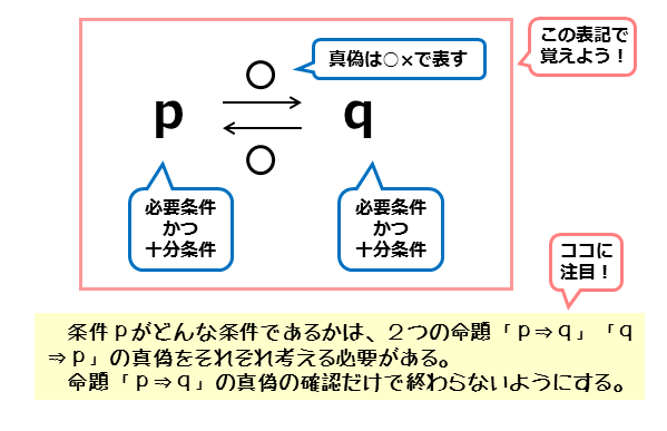 一般に、2つの命題がともに真であるとき、「pはqであるための必要十分条件である(同様にqはpであるための必要十分条件である)」と言います。