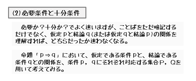 「命題「p⇒q」が真であるとき、qはpであるための十分条件」とは、結論qは仮定pから見れば、結論として必要な条件という意味です。