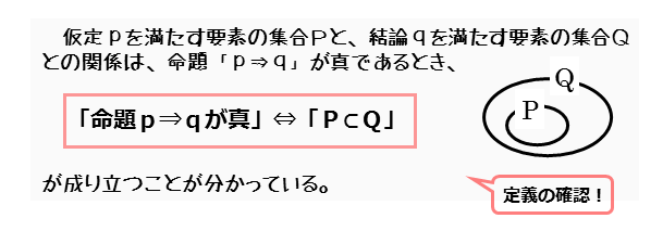 命題「p⇒q」が真であるとき、集合P,Qの間にはP⊂Qが成り立ちます。