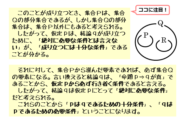 ですから、集合Qは、集合Pにとって十分ではないけれど、(命題がP⇒Qが成り立つのに)必要な集合です。