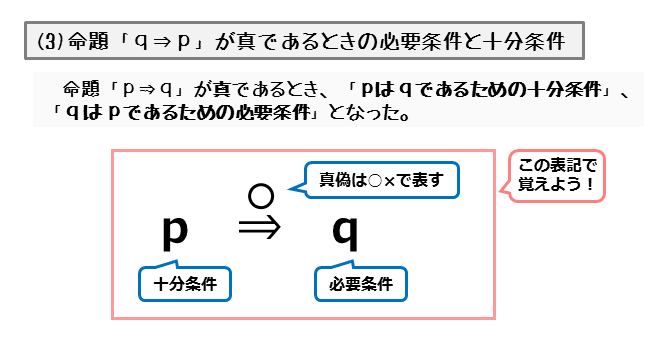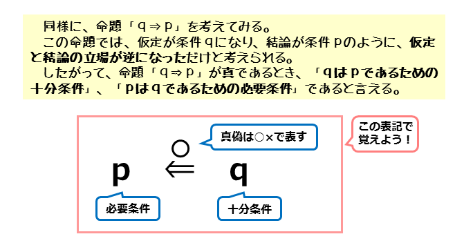 したがって、命題「q⇒p」が真であるとき、仮定qは結論pであるための十分条件、結論pは仮定qであるための必要条件となります。