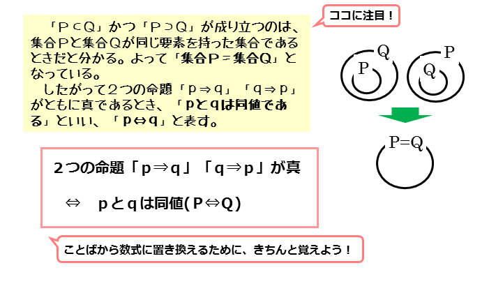条件p,qがともに必要十分条件になるとき、集合ではその大きさも要素の数もすべて同じになるので、同値であると言います。ちなみに、pとqが同値であることを「p⇔q」と記述します。