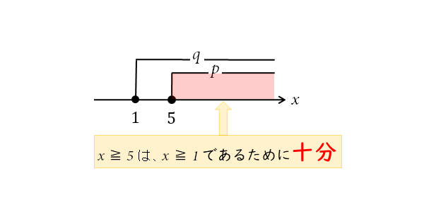 数直線を見ると、x≧5であるために、x≧1であることは条件として十分ではあります。