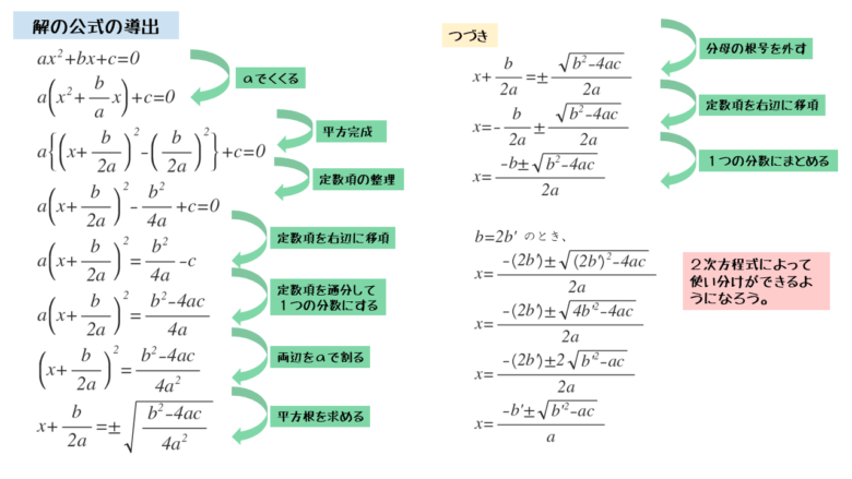 \begin{align*} a{x}^{2}+bx+c &= 0 \\[ 7pt ] a\left({x}^{2}+\frac{b}{a} x \right) +c &= 0 \\[ 7pt ] a\left\{ \left(x+\frac{b}{2a} \right)^{2}-\frac{{b}^{2}}{4{a}^{2}} \right\} +c &= 0 \\[ 7pt ] a{\left(x+\frac{b}{2a} \right)}^{2}-\frac{{b}^{2}}{4a} +c &= 0 \\[ 7pt ] a{\left(x+\frac{b}{2a} \right)}^{2}-\frac{{b}^{2}-4ac}{4a} &= 0 \\[ 7pt ] a{\left(x+\frac{b}{2a} \right)}^{2} &= \frac{{b}^{2}-4ac}{4a} \\[ 7pt ] {\left(x+\frac{b}{2a} \right)}^{2} &= \frac{{b}^{2}-4ac}{4{a}^{2}} \\[ 7pt ] x+\frac { b }{ 2a } &= \pm \frac{\sqrt {{b}^{2}-4ac}}{2a} \\[ 7pt ] x &= -\frac{b}{2a} \pm \frac{\sqrt{{b}^{2}-4ac}}{2a} \\[ 7pt ] x &= \frac{-b \pm \sqrt{{b}^{2}-4ac}}{2a} \end{align*}また、$b=2b’$ のとき