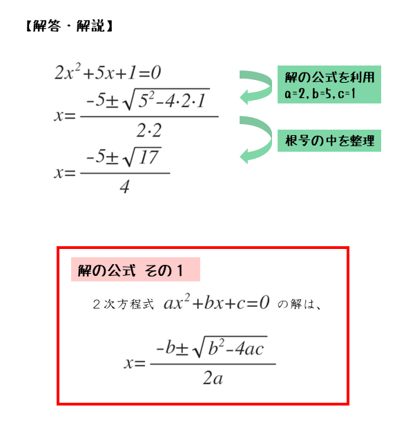 \begin{align*} \quad x = \frac{-5 \pm \sqrt{17}}{4} \end{align*}与式と公式の対応関係を正しく把握することが大切です。