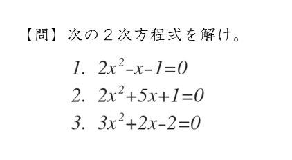 \begin{align*} \quad 3x^{2}+2x-2=0 \end{align*}問3の式も因数分解できないので、解の公式を使って解きます。ただし、1次の項の係数が偶数なので、解の公式の応用版を使います。