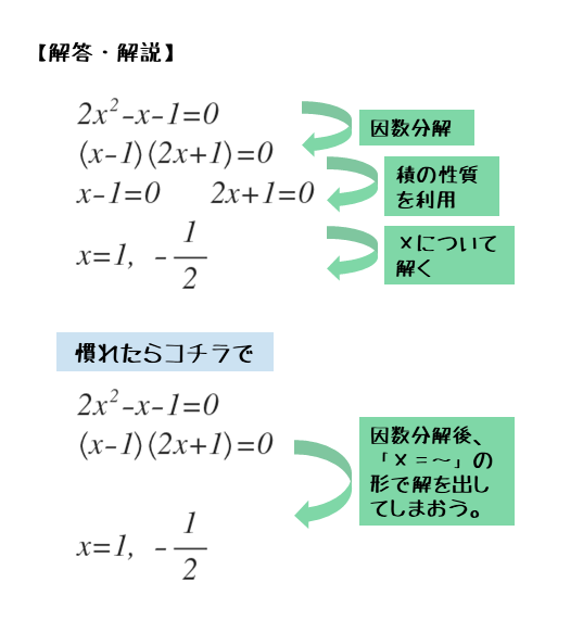 \begin{align*} \quad 2x^{2}-x-1 &=0 \\[ 7pt ] \left(x-1 \right)\left(2x+1 \right) &=0 \end{align*}左辺の2次式を因数分解すると、1次式どうしの積の形になります。
